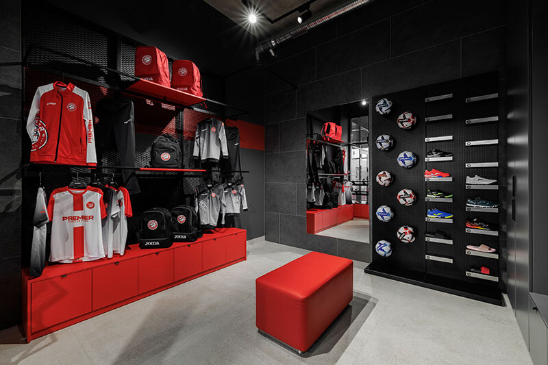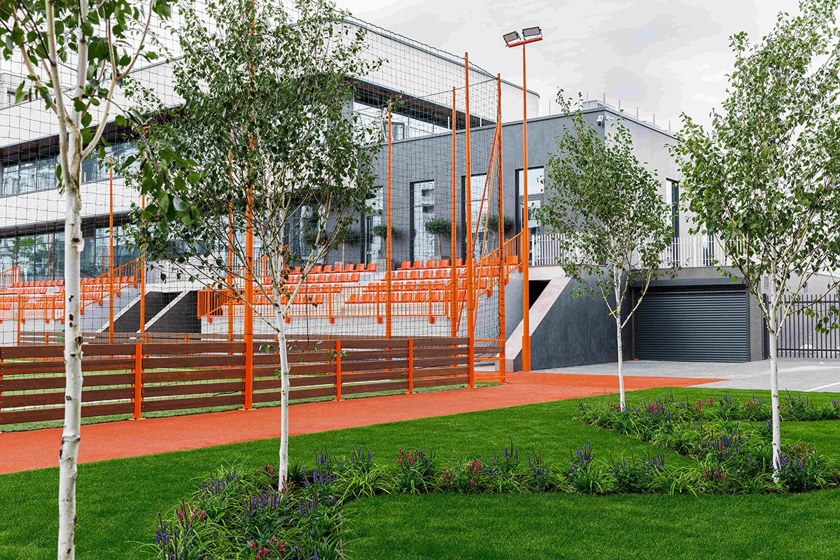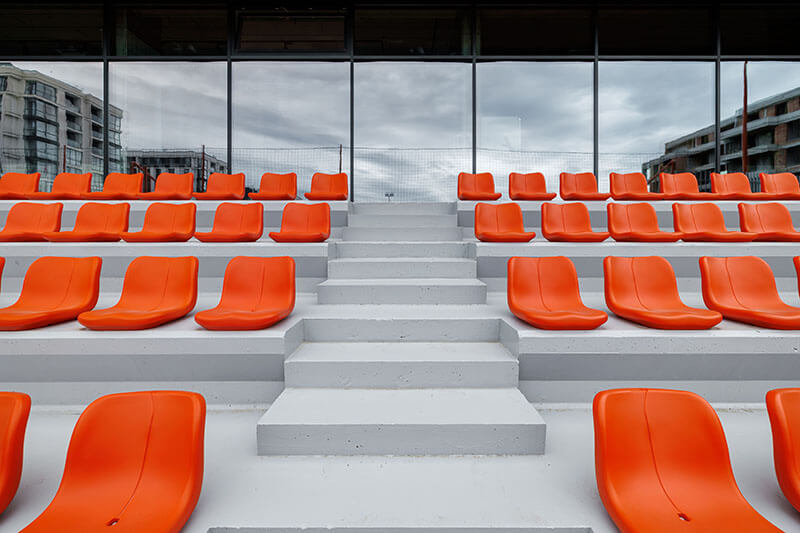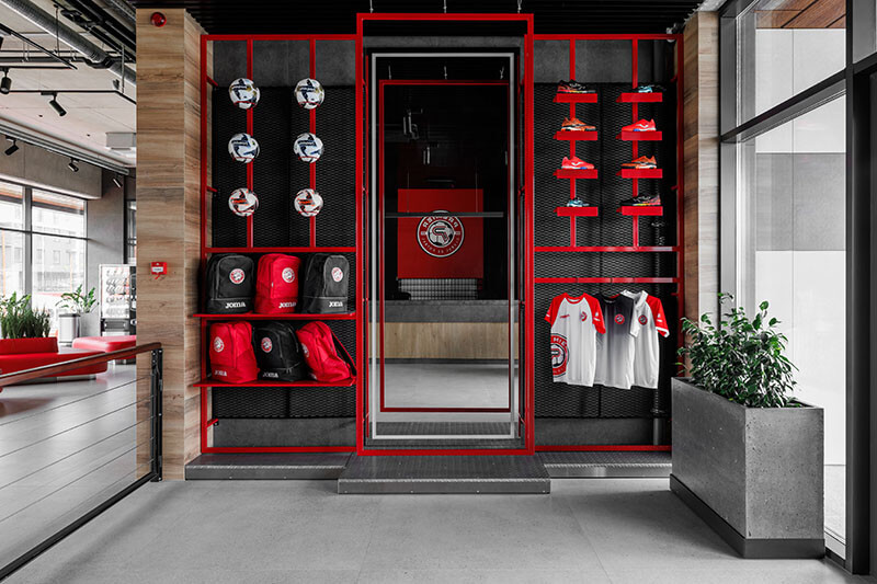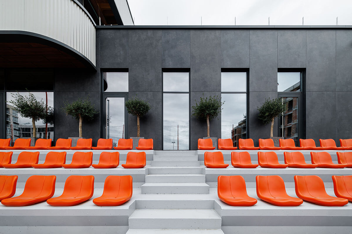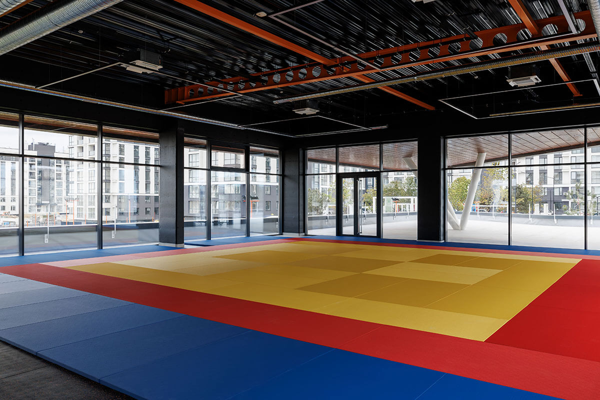 Die Eingangsebene beherbergt Kursräume und ein Café mit Panoramablick auf den Platz. Hier können Eltern Kaffee trinken und ihren Kindern beim Training zuschauen. Im Obergeschoss bekommen Erwachsene ihre eigene Fitnesszone mit Box- und Yogabereichen. Die untere Ebene wurde in den Hang hineingebaut. Sie enthält die Umkleiden und die Tribünen mit bestem Blick auf das Spielfeld.