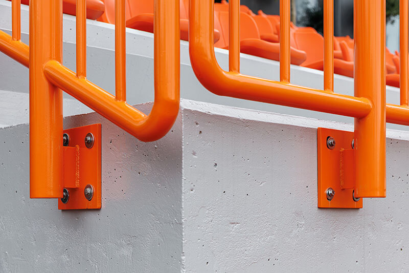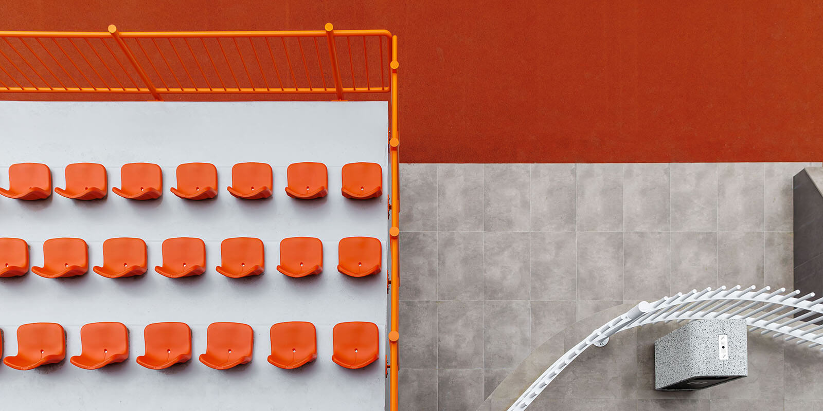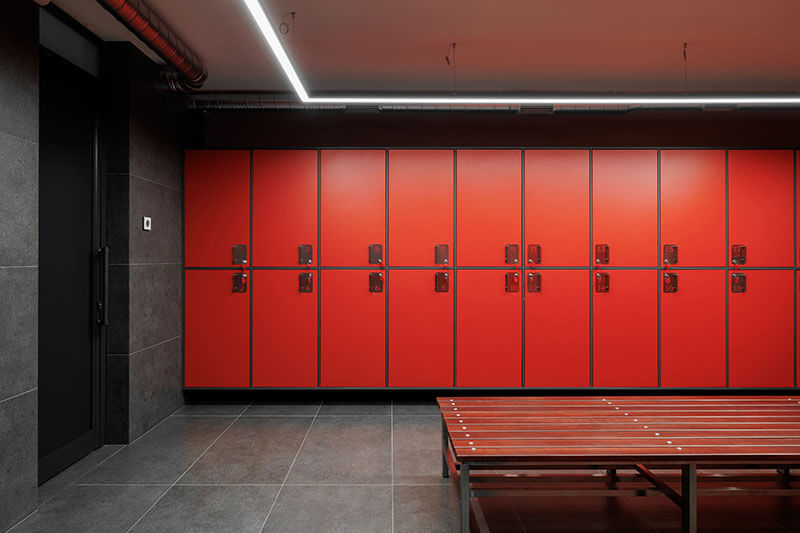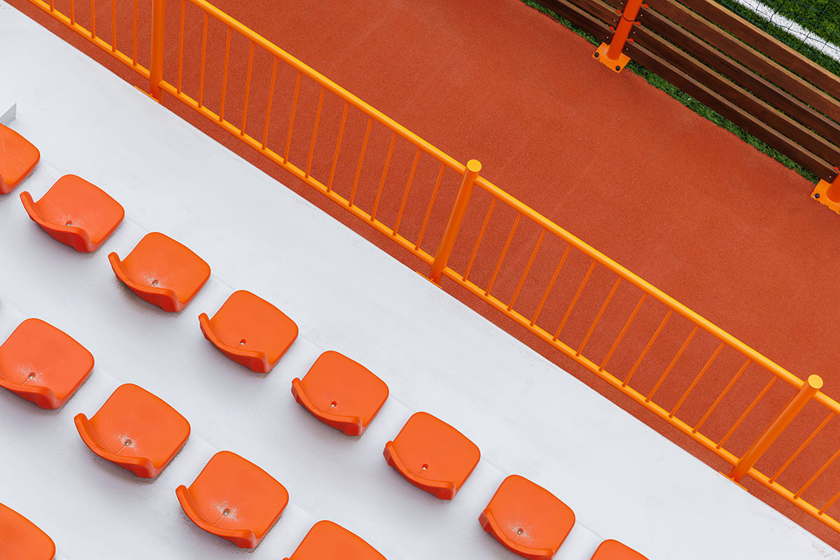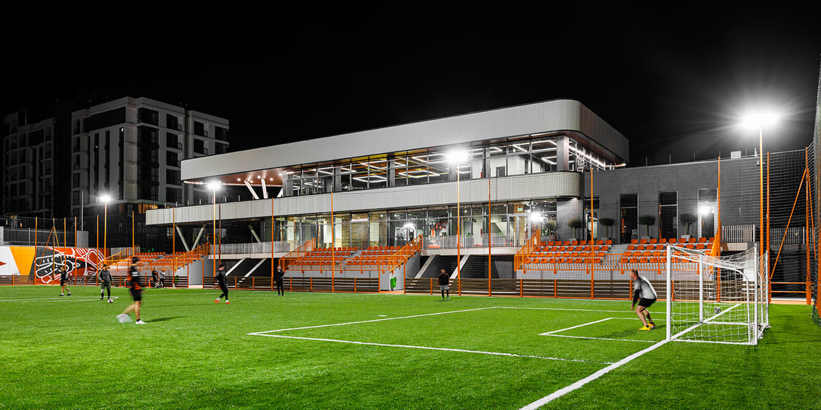 Die Eingangsebene beherbergt Kursräume und ein Café mit Panoramablick auf den Platz. Hier können Eltern Kaffee trinken und ihren Kindern beim Training zuschauen. Im Obergeschoss bekommen Erwachsene ihre eigene Fitnesszone mit Box- und Yogabereichen. Die untere Ebene wurde in den Hang hineingebaut. Sie enthält die Umkleiden und die Tribünen mit bestem Blick auf das Spielfeld.