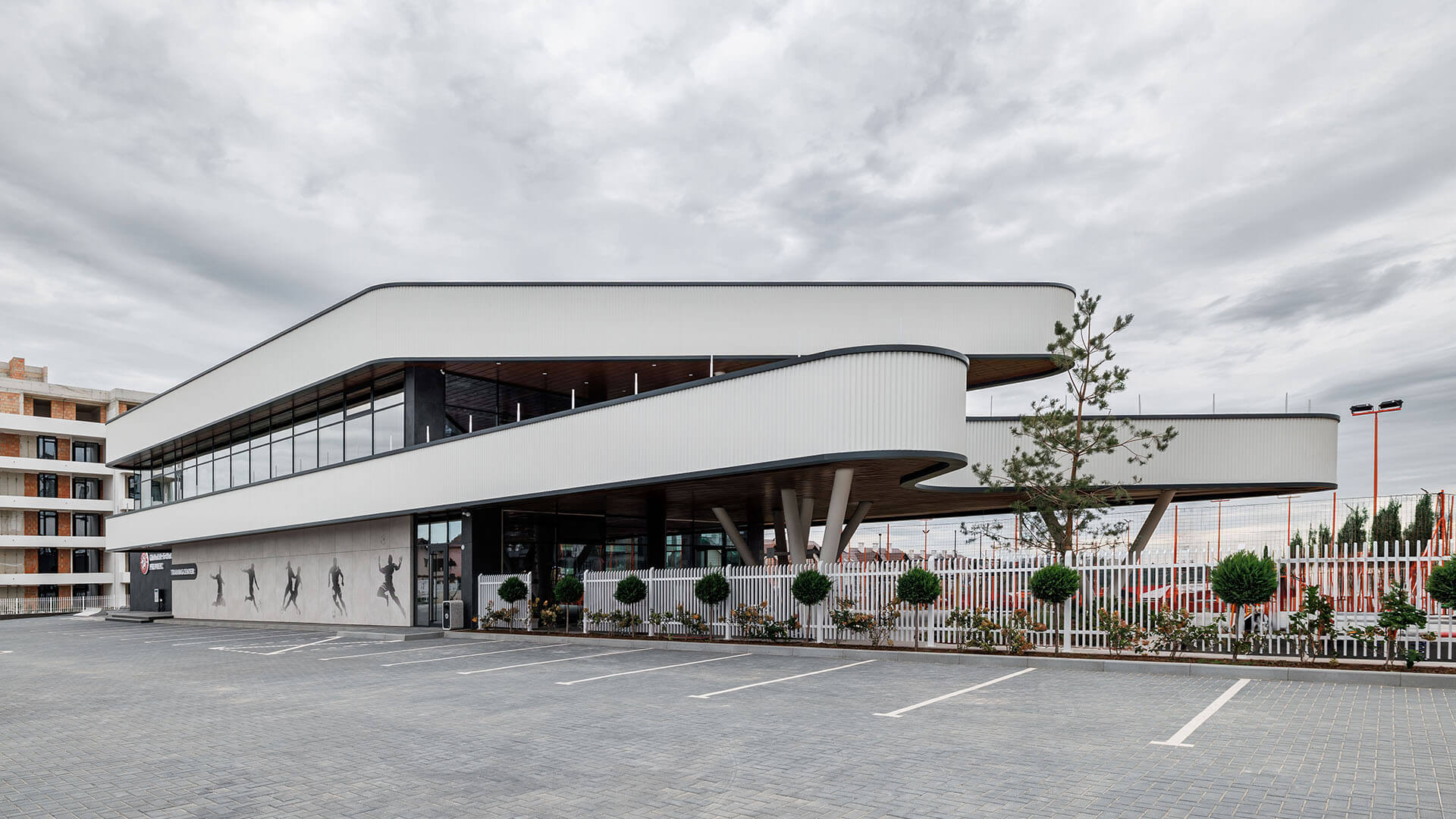 Ästhetisch bricht das Sportzentrum Durlești mit den kastenförmigen, utilitaristischen Sportanlagen, die wir alle kennen. LH47 erschufen biomorphe Linien und geneigte Säulen, schwebende Balkone und transparente Fassaden. Bäume sind in die Landschaftsgestaltung eingewoben, um natürlichen Schatten zu spenden.