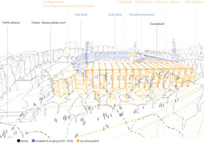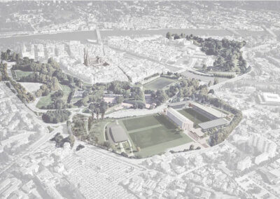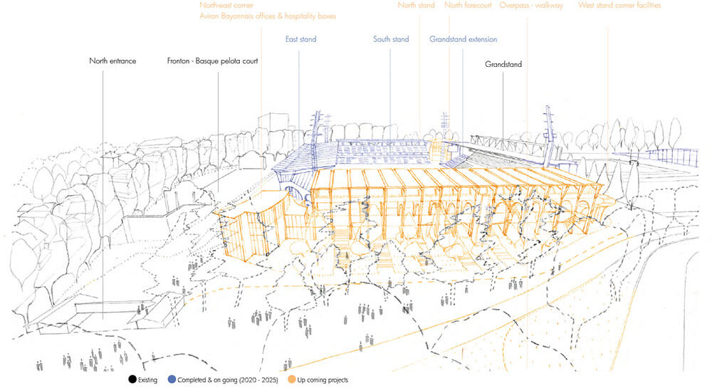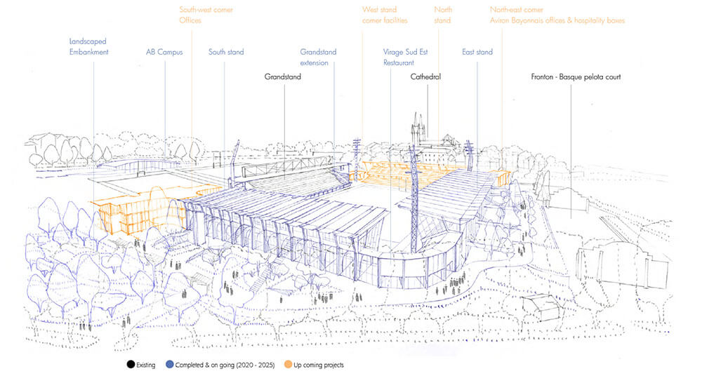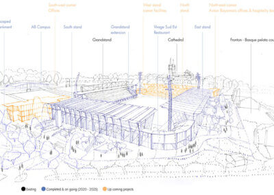 Die jüngste Um- und Neugestaltung des Sportkomplexes ist Teil einer übergeordneten städtebaulichen Strategie, die den historischen Grüngürtel Bayonnes stärkt und zugleich für zeitgemäße Mobilität, Aufenthaltsqualität und Mehrfachnutzung öffnet. Ziel war es, das Stadion nicht als isoliertes Sportobjekt, sondern als integralen Bestandteil des städtischen Freiraums zu begreifen.