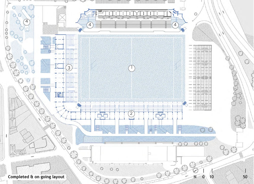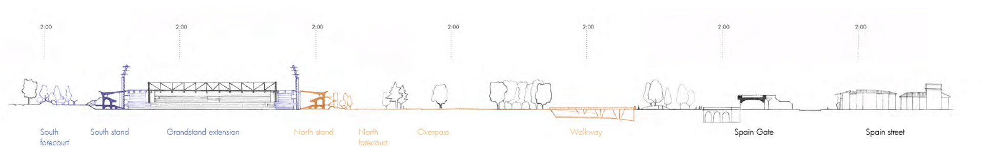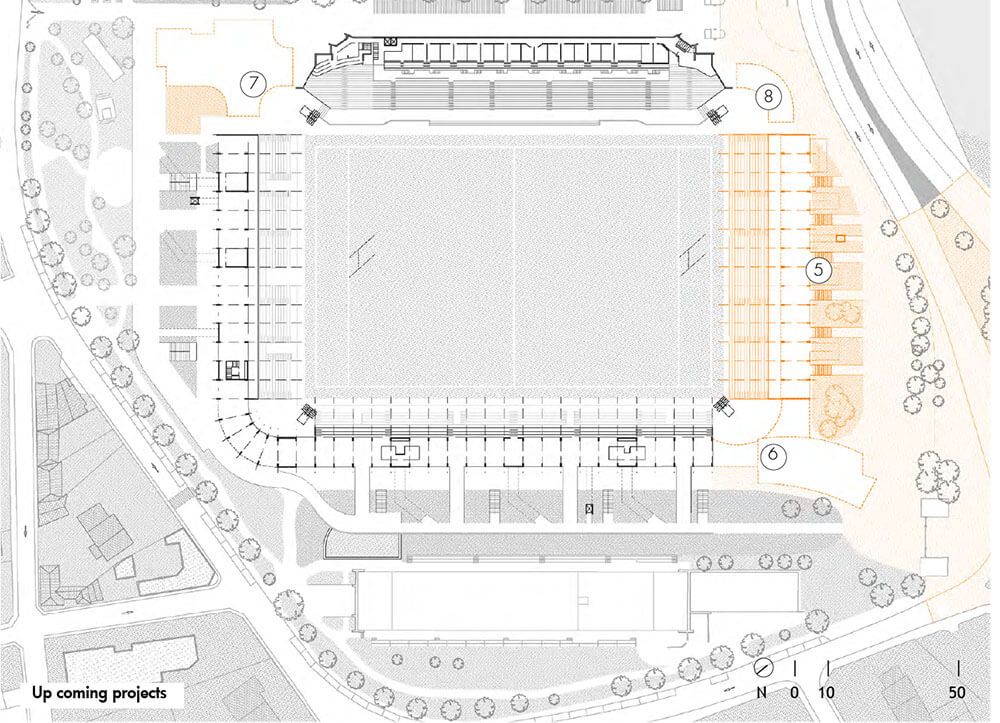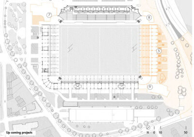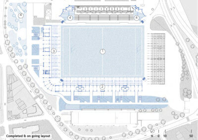 Die Südtribüne nimmt eine besondere Rolle ein. Ihre unteren Ränge sind teilweise ins Gelände eingegraben, während die Hospitality-Bereiche direkt an das Straßenniveau anschließen. Es entsteht ein urbanes Szenario aus Vorplatz, Lounge, Arkaden und Spielfeldblick – auch von außen wahrnehmbar.