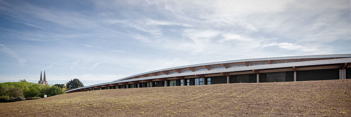 Architektonisch tritt der Bau bewusst zurück: Seine gewölbte Form folgt der Topografie und den neu geschaffenen Landschaftshügeln entlang der Busspur. Statt eines dominanten Solitärs entsteht ein Baukörper, der sich in den Grüngürtel einfügt und die historische Haupttribüne visuell freistellt. Materialität und Sprache sind reduziert – Sichtbeton, Holz, dunkelgrünes Mauerwerk und ein großes Aluminiumdach –, um Landschaft und Bestand wirken zu lassen.