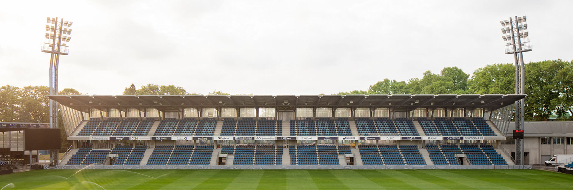 Ungewöhnlich für Stadionbauten dieser Größenordnung ist die Erschließung: Treppen, Stege und Umläufe liegen außerhalb der Tribünenkörper und führen die Besucherinnen und Besucher quasi durch den Park. Filigrane Stahlkonstruktionen, Sichtbeziehungen durch Baumkronen und Einblicke in die Innenräume der Tribünen erzeugen ein vielschichtiges räumliches Erlebnis zwischen Stadt, Park und Stadion.