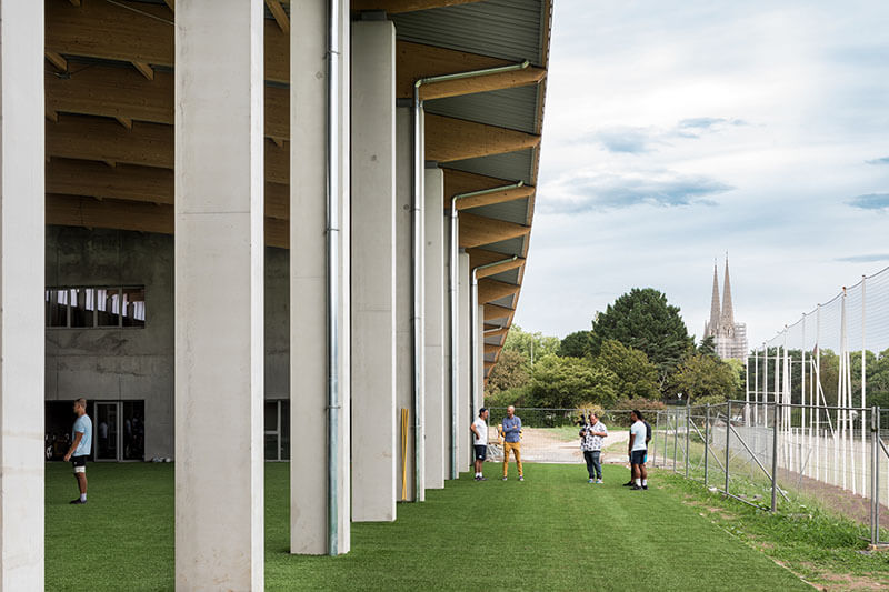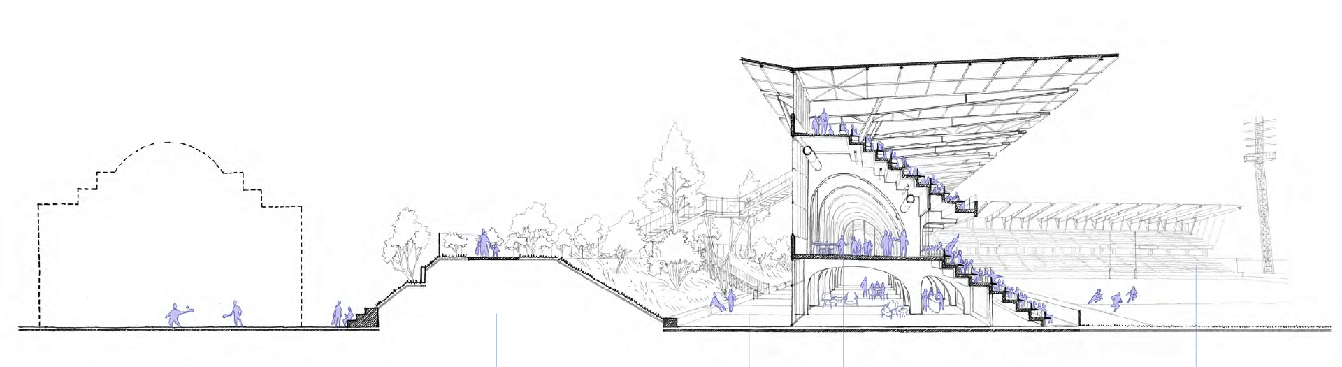 Ein wesentliches Merkmal des Projekts ist die enge Verzahnung von Architektur und Landschaft. Die neuen Tribünen sind zweirangig organisiert, mit großzügigen Umgangsflächen und einem weit auskragenden Dach. Von Osten und von der Straße aus scheint der Baukörper teilweise im begrünten Geländesprung zu verschwinden – seine Massivität wird durch Böschungen, Vegetation und Höhenstaffelung bewusst reduziert.