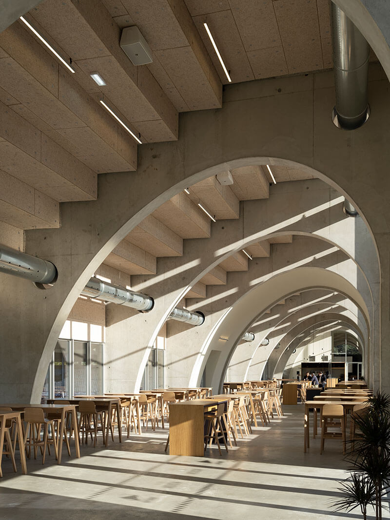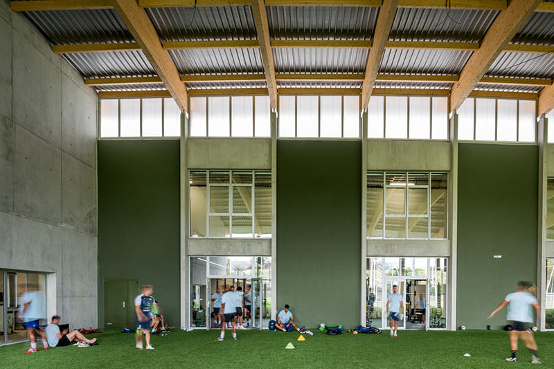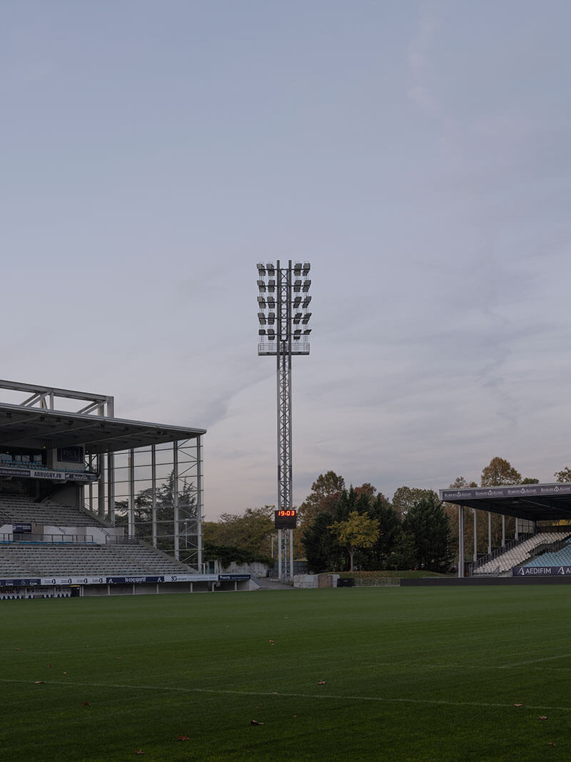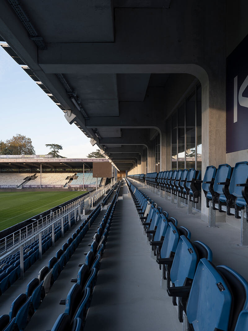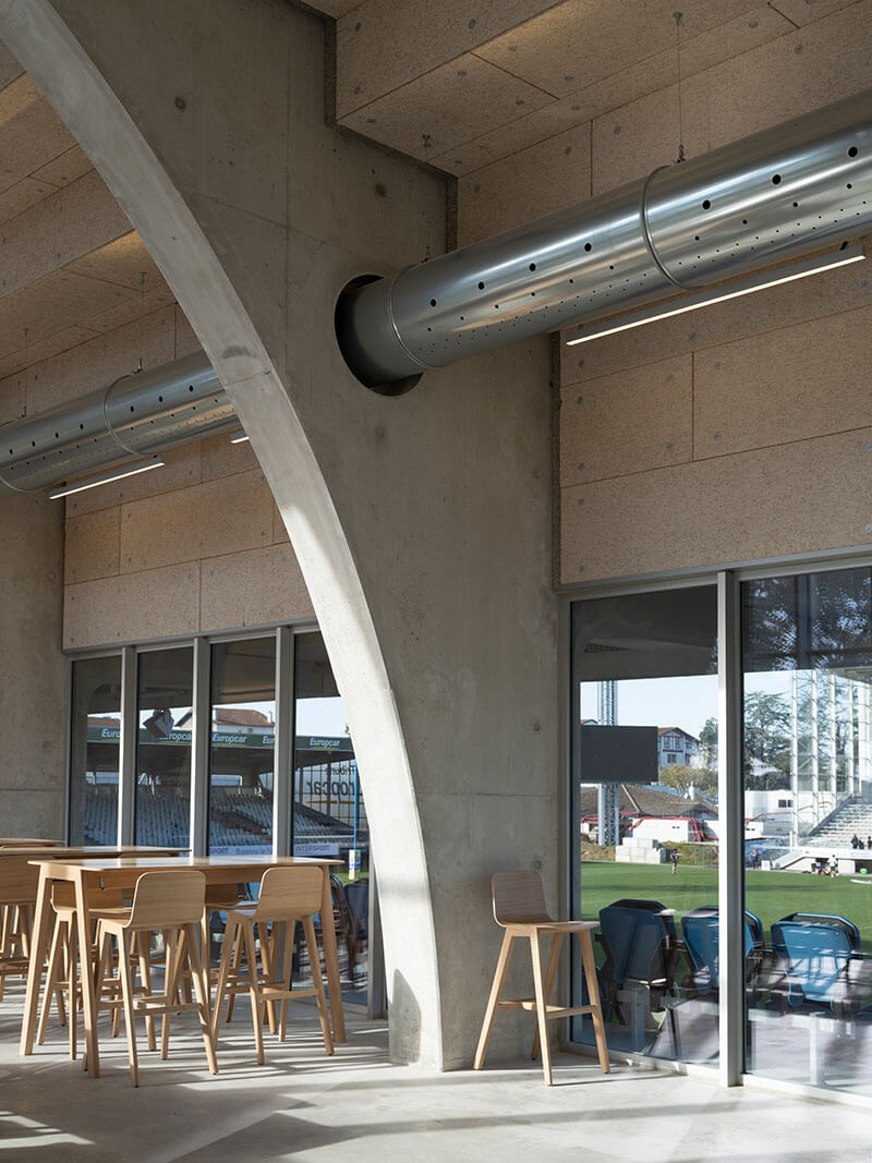 Die Räume sind bewusst verglast und sowohl vom Park als auch vom Spielfeld aus einsehbar. Massive Betonbögen strukturieren die Innenbereiche und verleihen ihnen eine starke architektonische Identität. Diese Sichtbarkeit des „Inneren“ – Konstruktion, Nutzung, Bewegung – macht das Stadion auch im Alltag lesbar und belebt.