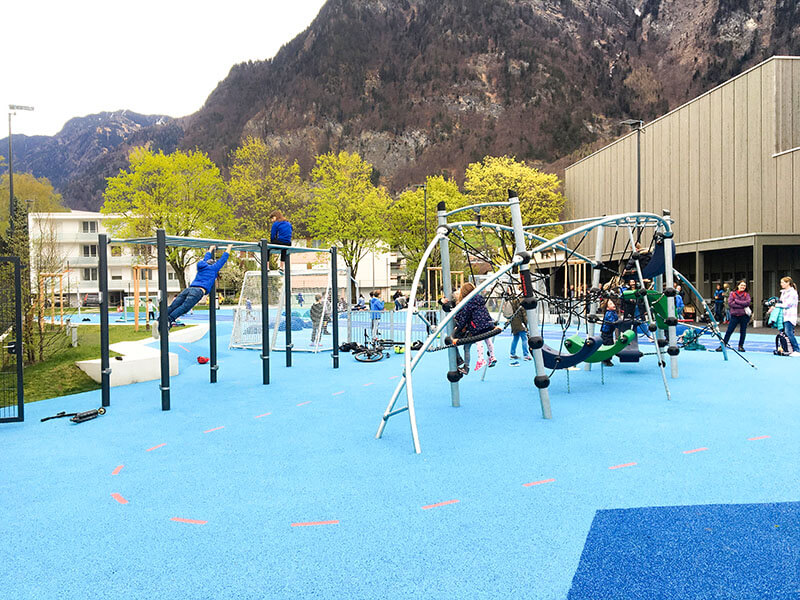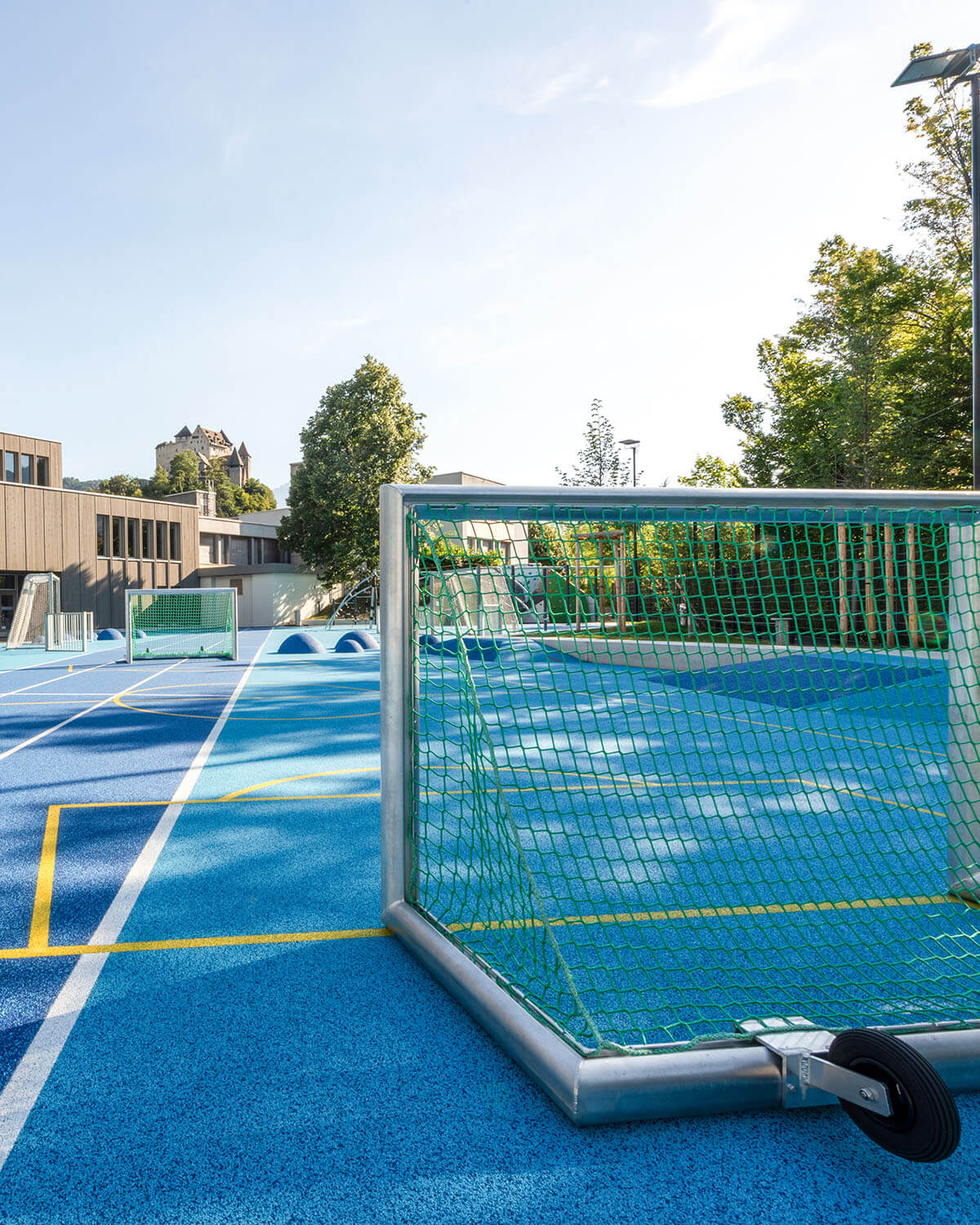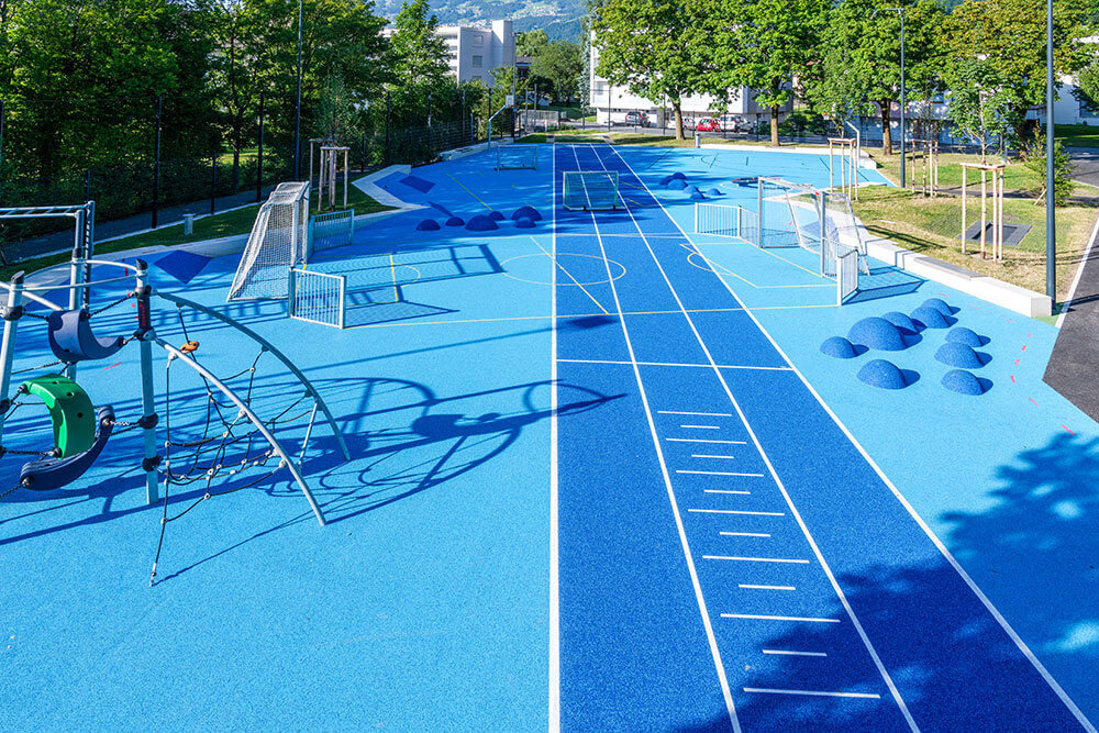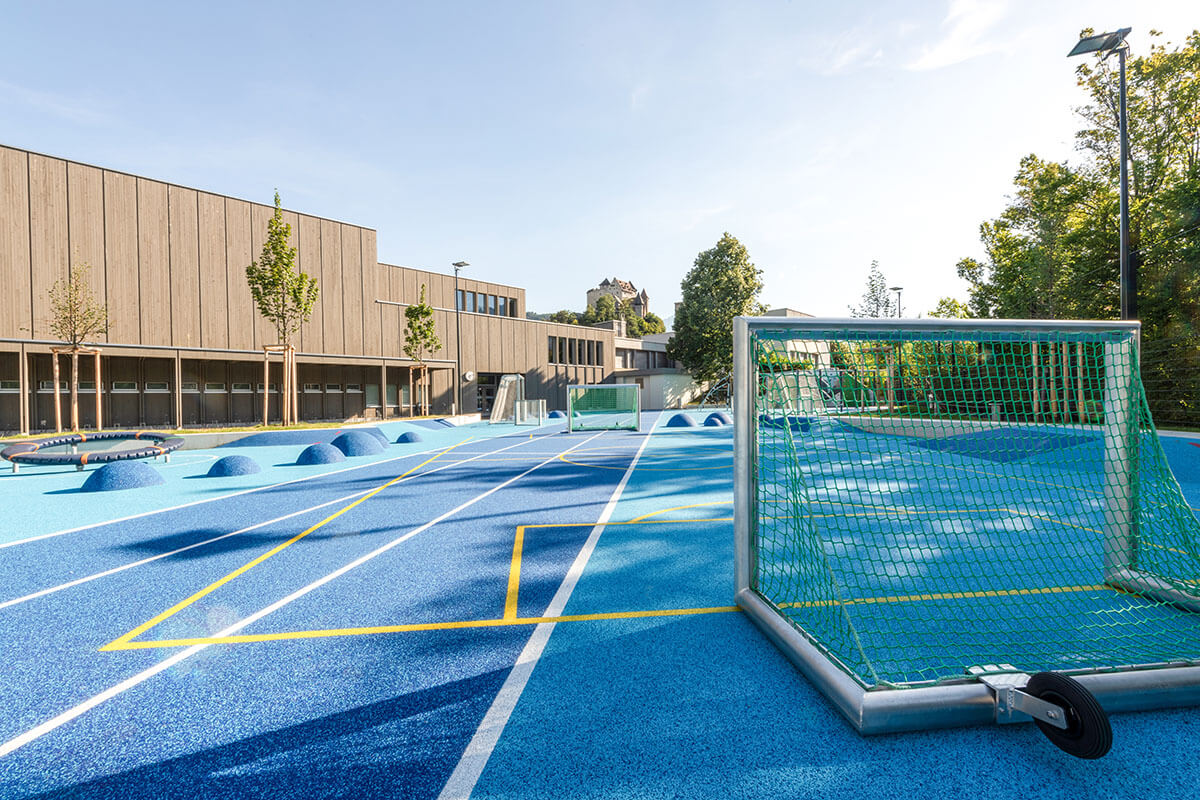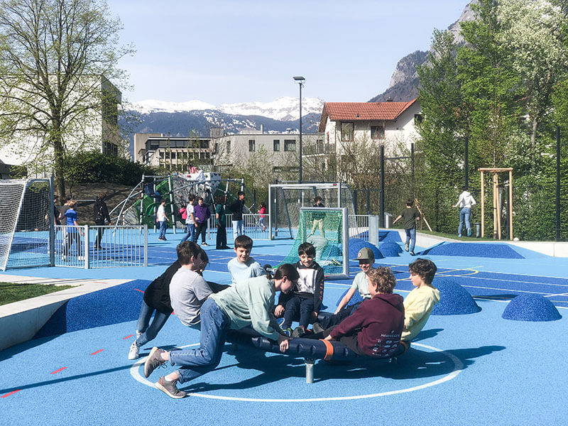 In der Gemeinde Balzers im Fürstentum Liechtenstein entstand in unmittelbarer Nähe zu einer Grund- und einer Realschule ein ausgesucht vielseitiger Allwetterplatz als Ersatz für einen eher monofunktionalen roten Kunststoffplatz: der Blaue Platz.