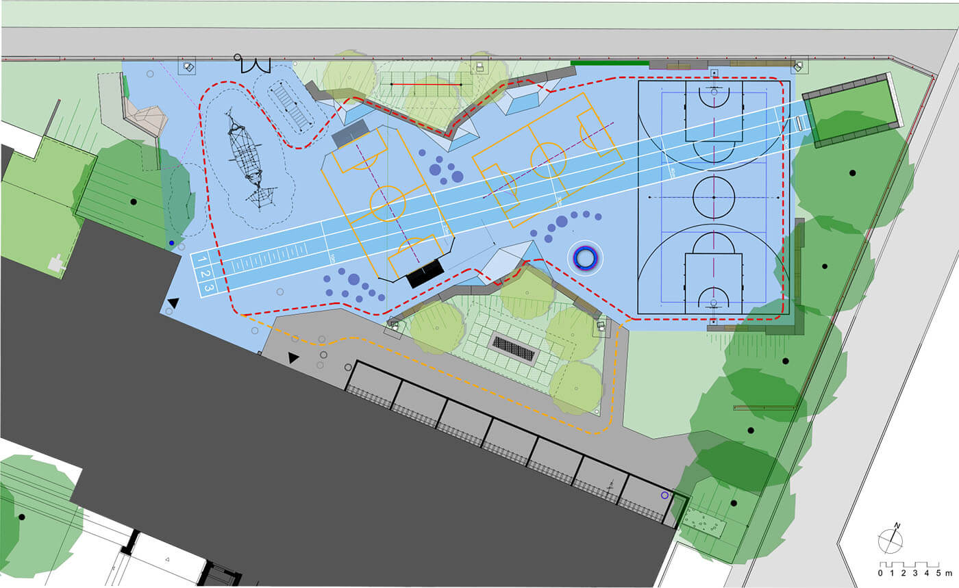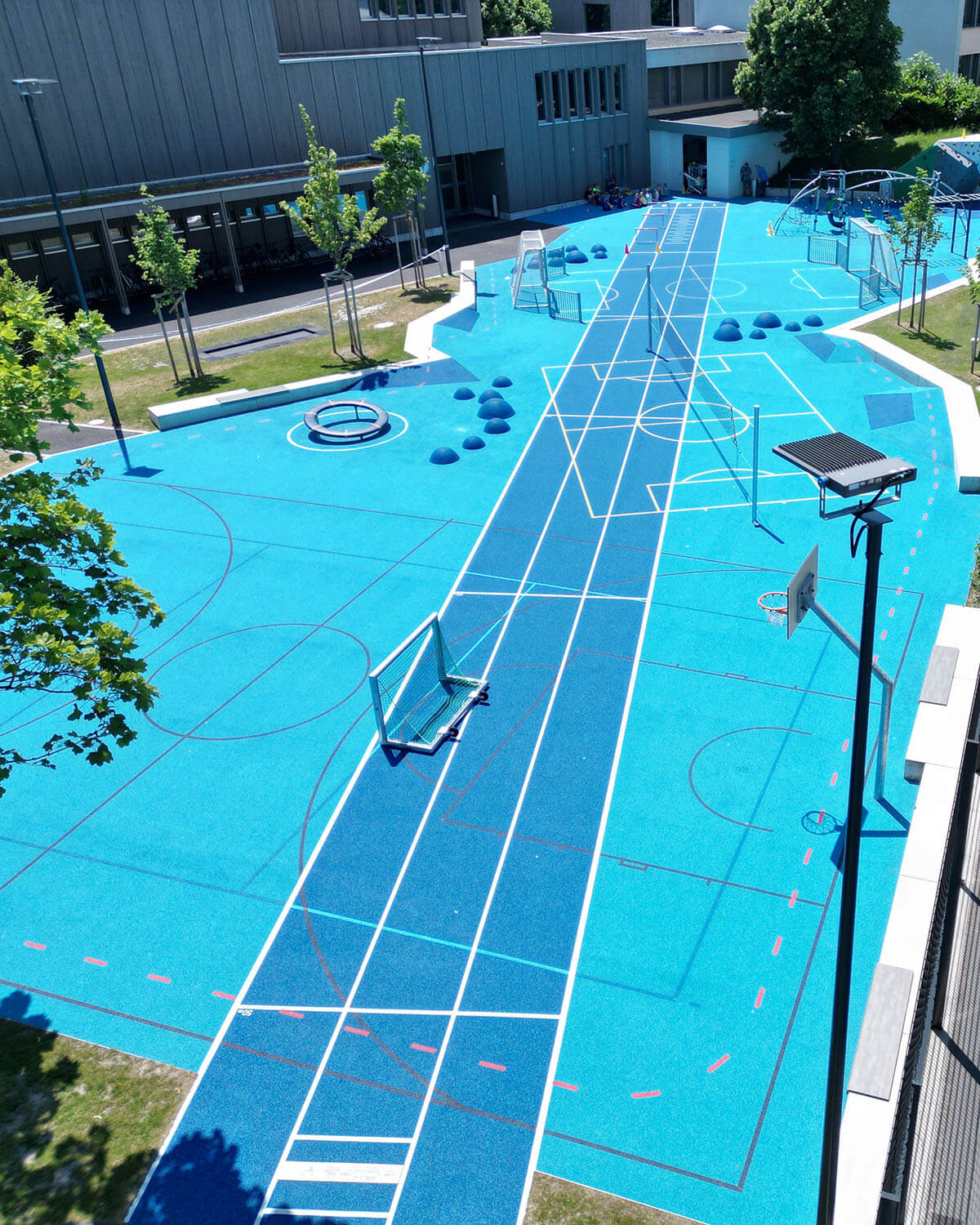Die Gestaltung folgt konsequent dem Prinzip der Inklusion. Alle Wege, Zugänge und Spielflächen sind so konzipiert, dass sie auch von Menschen mit Einschränkungen genutzt werden können. Die Überlagerung von Markierungen, die freie Formgebung und die variierenden Blautöne des PU-gebundenen Sportbelags schaffen eine einladende, intuitive Umgebung, die nicht vorgibt, wie man sich bewegen muss, sondern inspiriert, sich zu bewegen, wie man es möchte.
