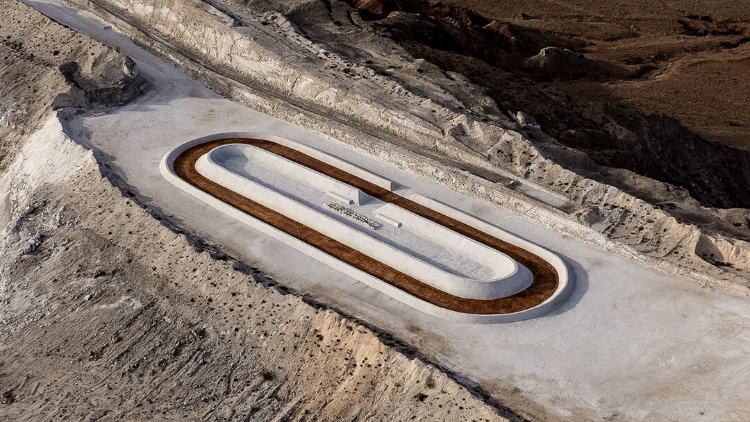 Adidas und das Design­studio PlayLab schufen in einem aktiven Gips­stein­bruch nahe Santa Fe eine Instal­la­tion, die Sport­ar­chi­tektur und Land­schaft für kurze Zeit vereint. Der EQT Track ist kein Stadion und auch kein Trai­nings­zen­trum, sondern eine land­schaft­liche Inter­ven­tion;  ein tempo­räres Monu­ment für die Bewe­gung selbst.