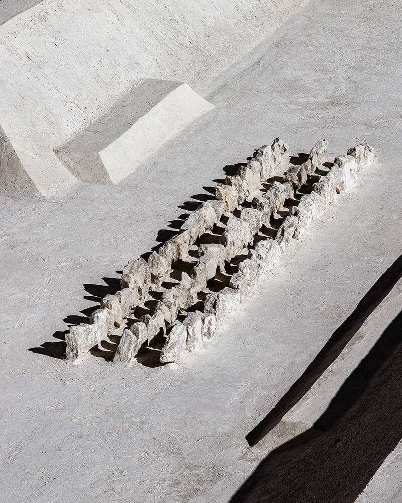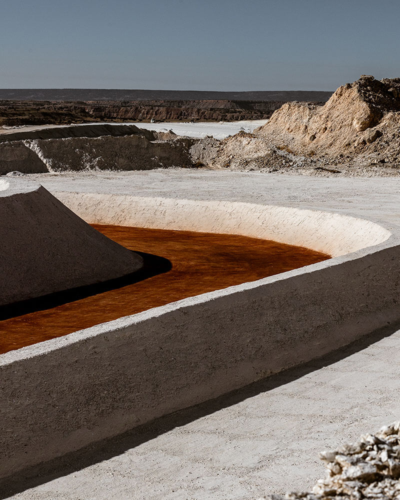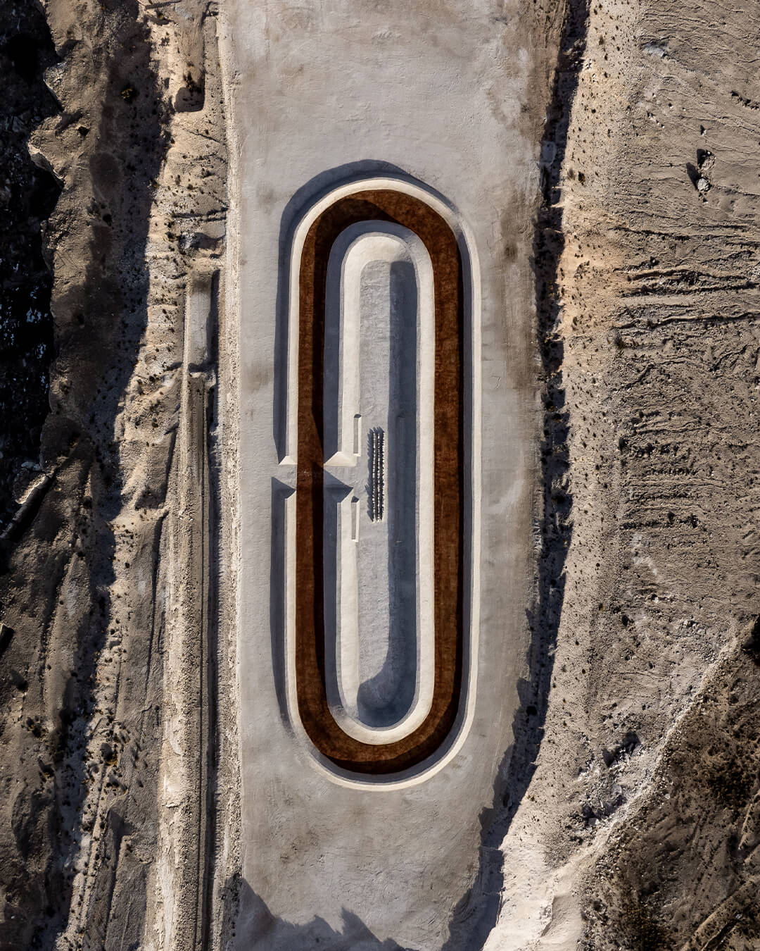Die Lauf­bahn wurde voll­ständig aus vorge­fun­denen Mate­ria­lien gebaut: Gips, Sand, Wasser und biolo­gisch abbau­bare Pigmente. Kein Asphalt, kein Kunst­stoff, keine impor­tierten Baustoffe. Der Unter­grund wurde geformt, verdichtet und mit einer sanft schim­mernden, weißen Ober­fläche versehen, die im Sonnen­licht fast unsichtbar mit der Land­schaft verschmilzt.
