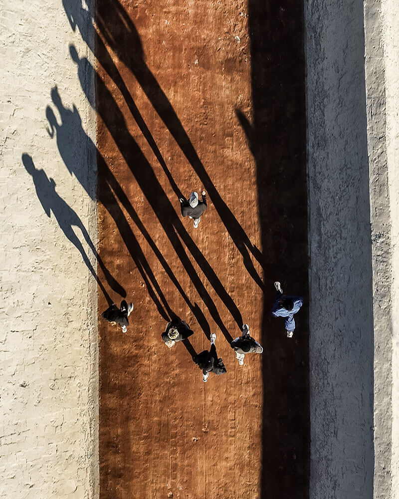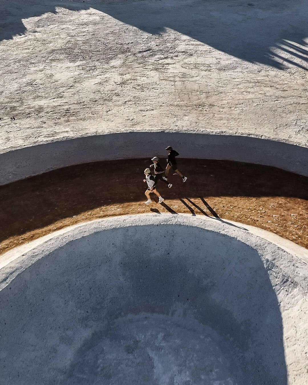 Von oben betrachtet zeichnet sie sich kaum vom hellen Unter­grund ab – eher eine Geste als ein Bau. Aus der Nähe aber offen­bart sie eine präzise, fast ritu­elle Ordnung. Kein Start, kein Ziel, keine Tribünen. Der Lauf wird zum Kreis, zur Medi­ta­tion. Bewe­gung wird Archi­tektur.