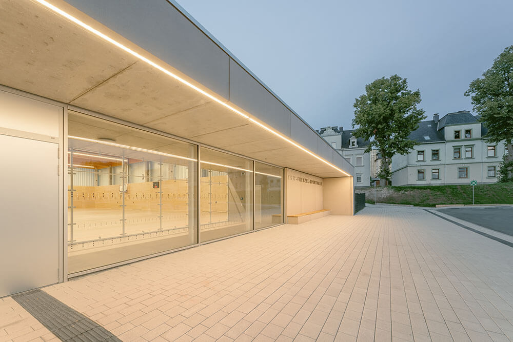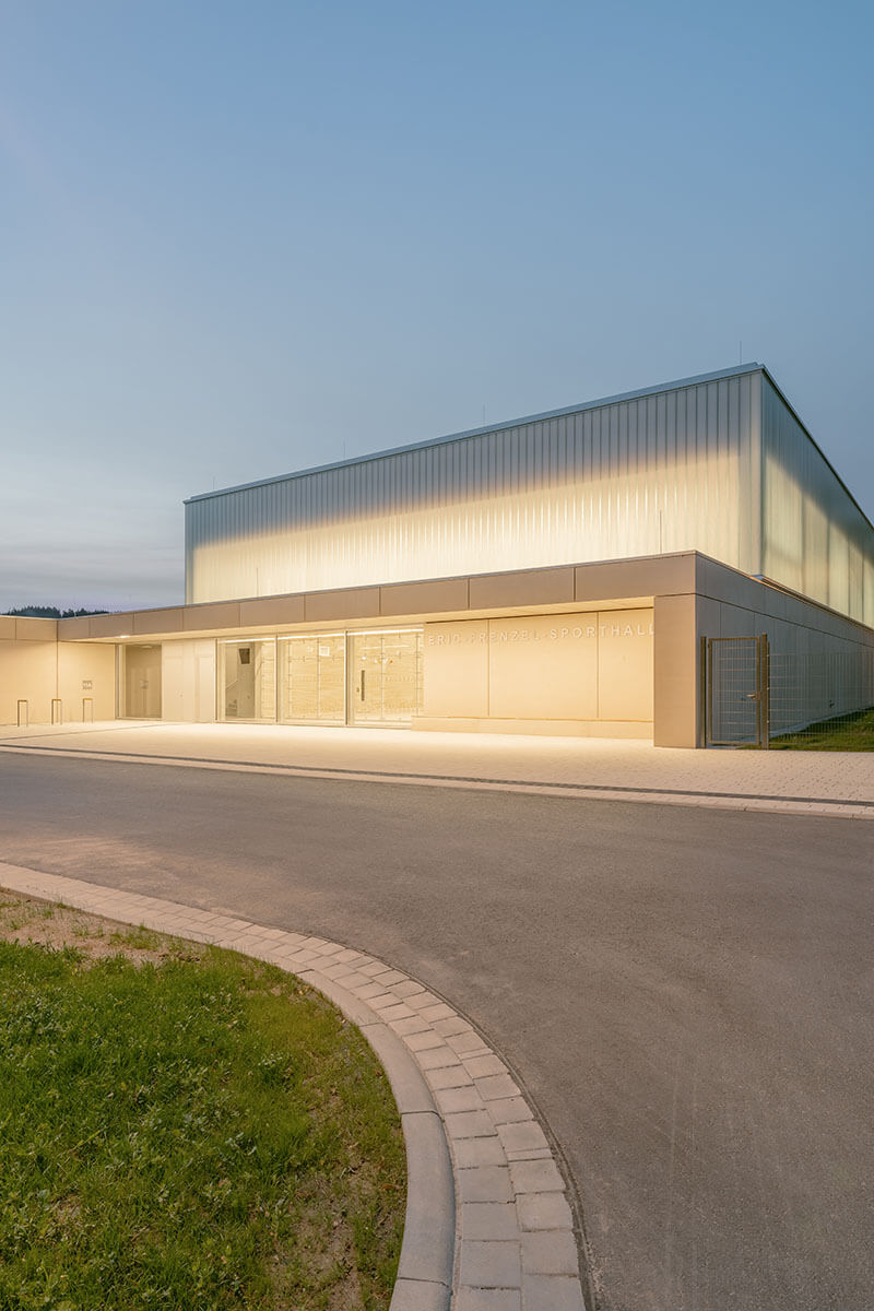 Mit der Eric-Frenzel-Sporthalle entstand in Geyer (Sachsen) ein markanter Baukörper, der durch Klarheit, Materialbewusstsein und funktionale Präzision überzeugt. Besonders prägend ist die transluzente Fassade aus Profilbauglas, die dem Gebäude Leichtigkeit, Ausstrahlung und Identität verleiht.
