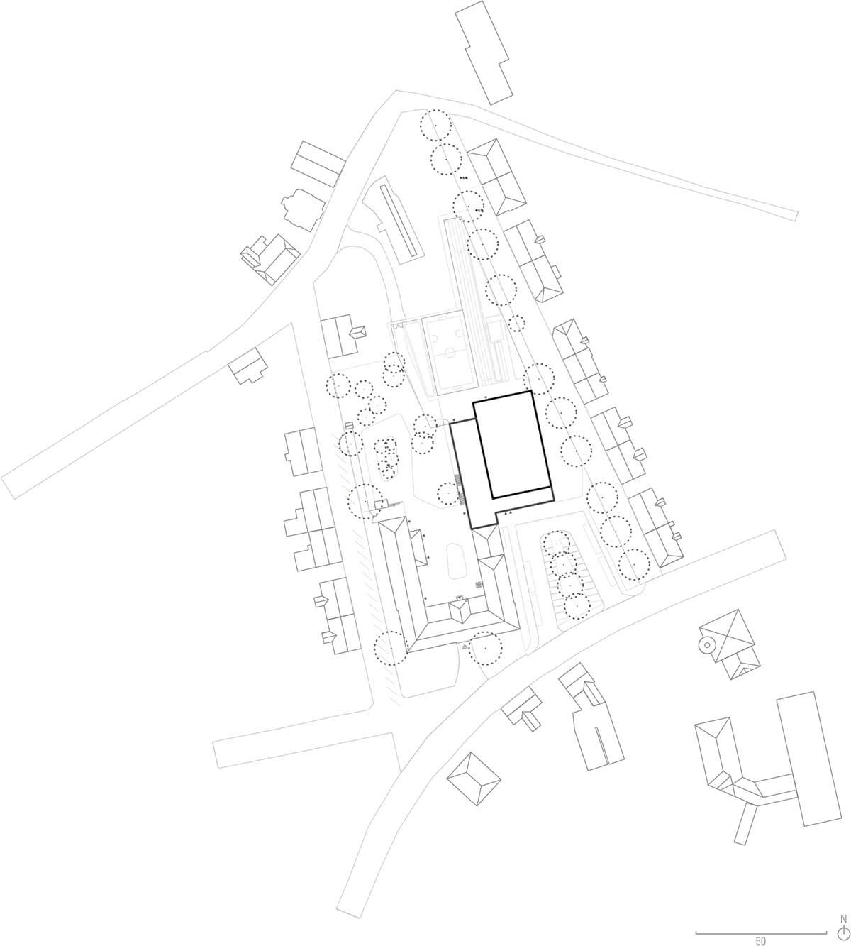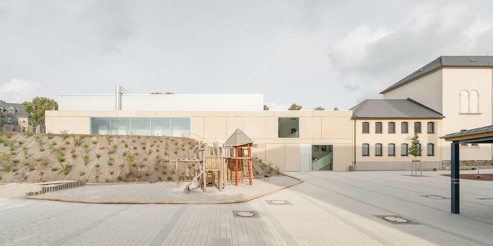 Mit dem Neubau der Zweifeld-Sporthalle auf dem Gelände des ehemaligen Bahnhofs wird der bestehende Grundschulstandort funktional und gestalterisch erweitert. Der Neubau ergänzt den östlichen Flügel des U‑förmigen Bestands und rahmt gemeinsam mit diesem einen introvertierten Schulhof, der als neue Mitte des Ensembles fungiert. Die Halle steht nicht nur den Schülerinnen und Schülern, sondern auch regionalen Sportvereinen und externen Nutzergruppen offen und leistet damit einen wichtigen Beitrag zur Integration des Bildungsstandorts in den städtischen Kontext.
