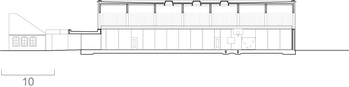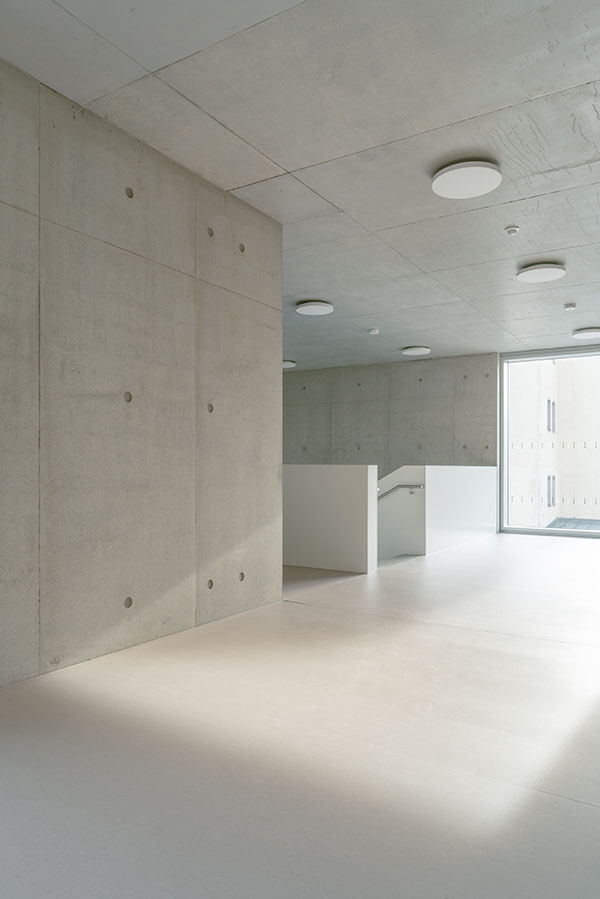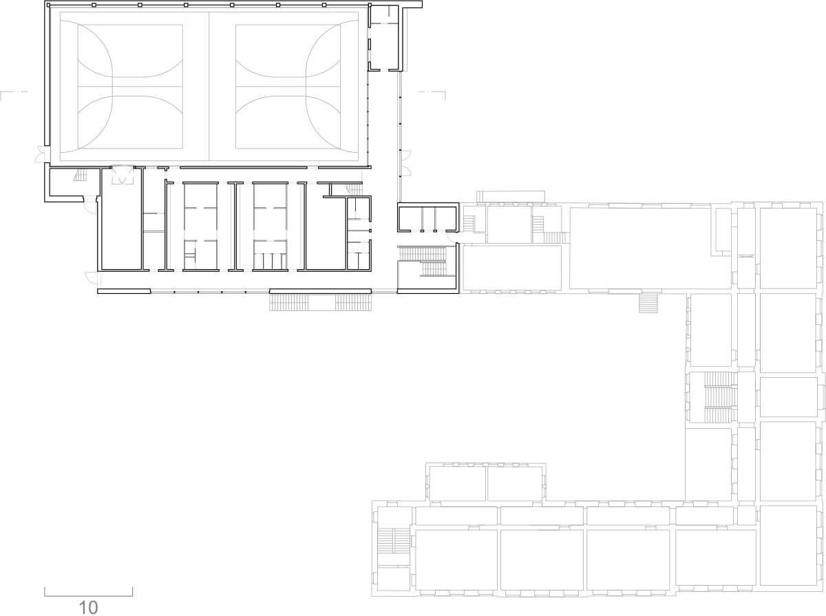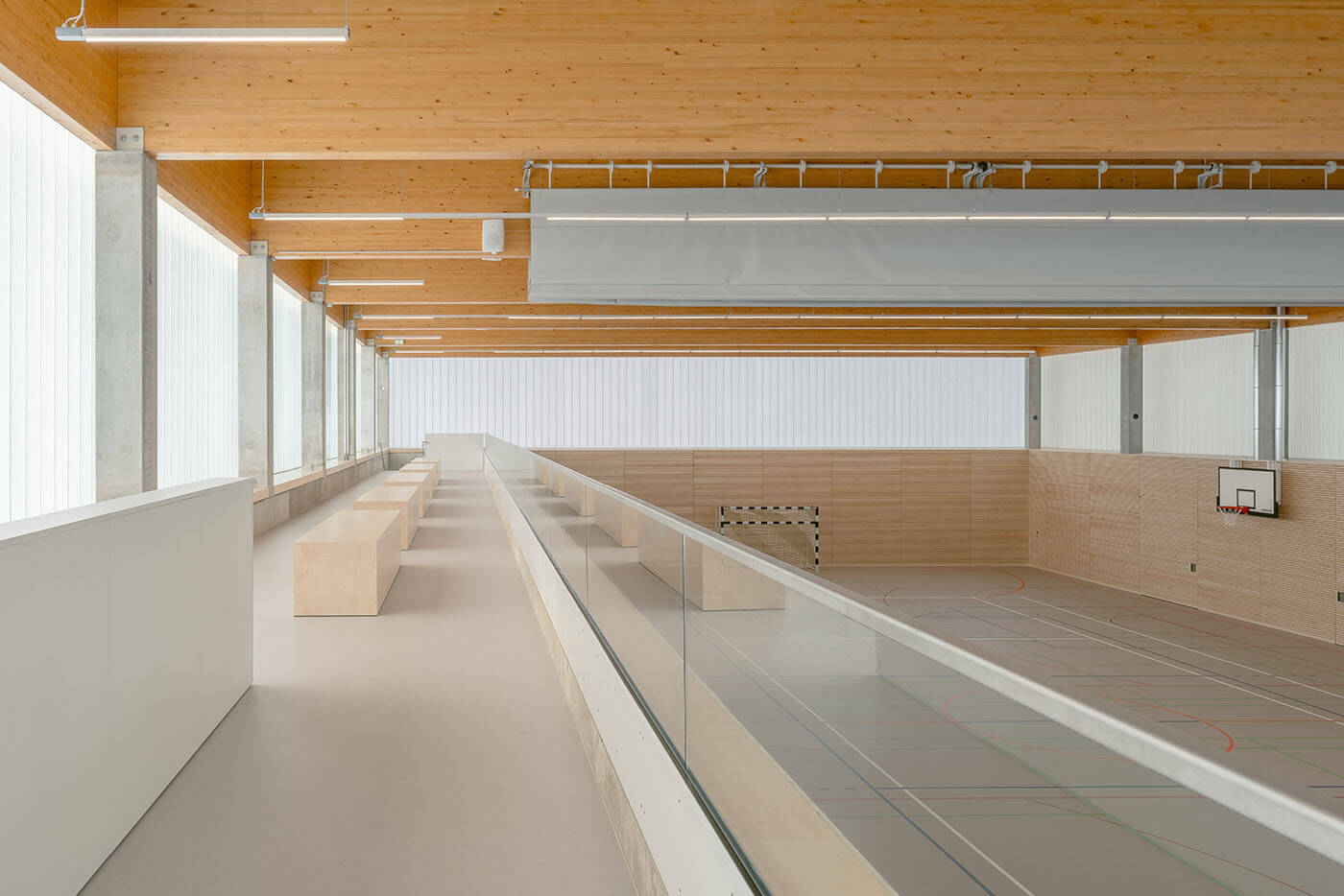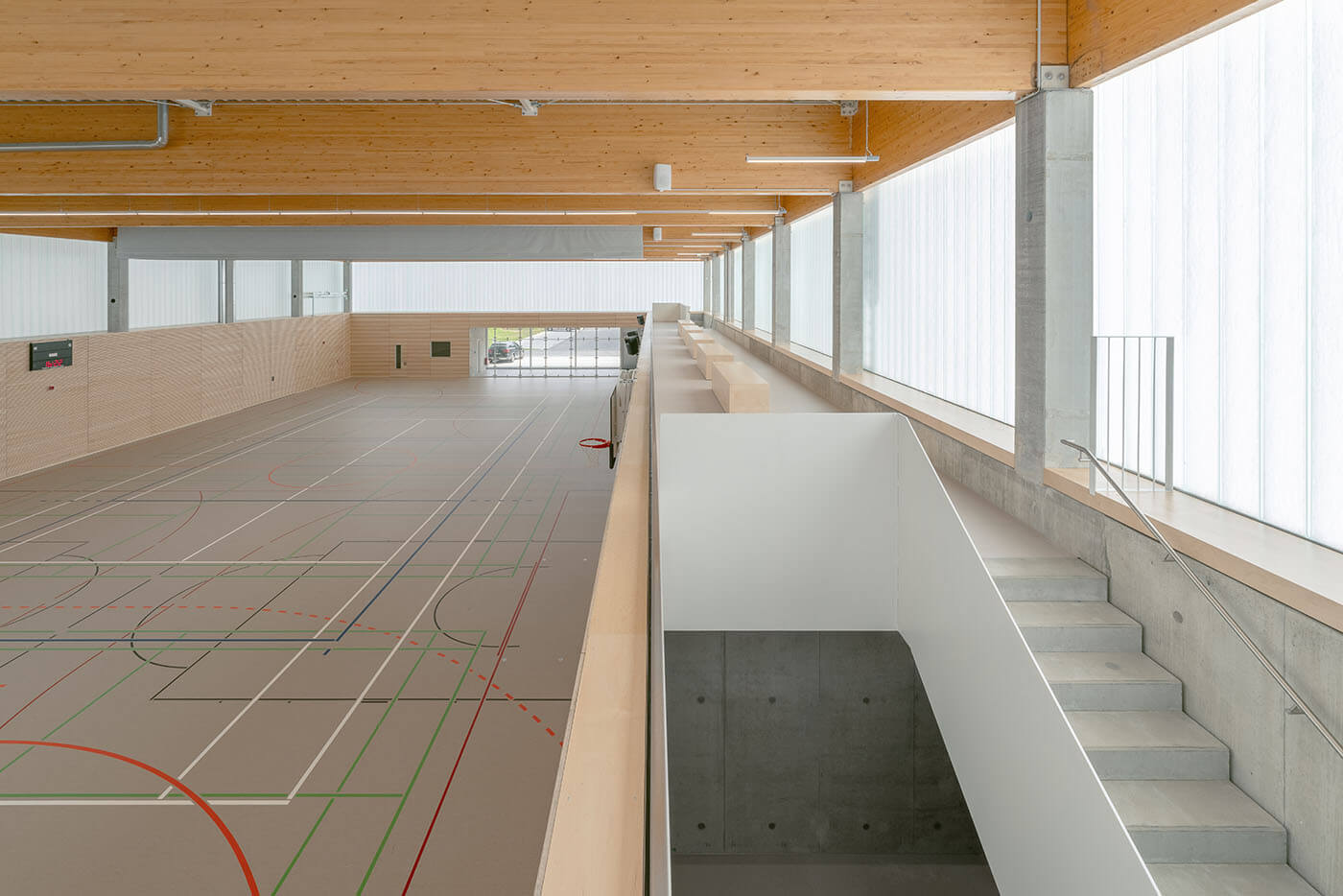 Die innere Organisation ist klar, kompakt und funktional. Über einen zweigeschossigen Baukörper ist die neue Sporthalle unmittelbar an das Schulgebäude angeschlossen. Zentrales Element ist das offene, lichtdurchflutete Foyer, das als Verteilerzone fungiert und den Übergang zwischen Schule, Halle und Zuschauerbereich vermittelt. Von hier aus sind die Tribüne mit 40 Sitzplätzen, die getrennten Zugänge für Turnschuh- und Stiefelbereich sowie die Halle selbst direkt erreichbar.