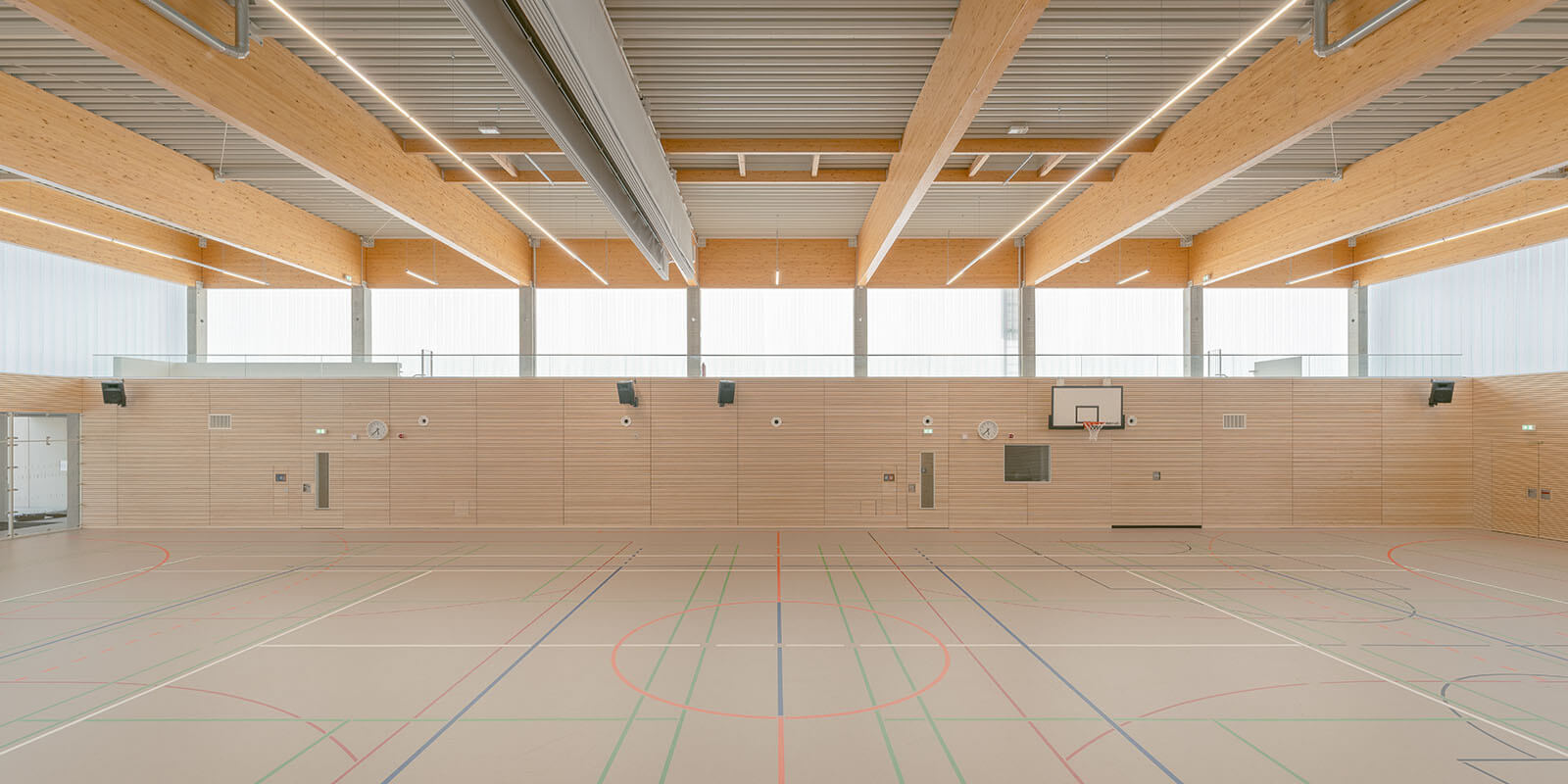 Die umlaufende Profilglasfassade gewährleistet eine blendfreie Tageslichtversorgung und unterstreicht die energetische Qualität des Konzepts. Mit ihrem optimierten A/V‑Verhältnis ist die Halle kompakt, ressourcenschonend und langlebig konstruiert – ein in vielerlei Hinsicht zeitgemäßes Beispiel nachhaltiger Sportarchitektur.