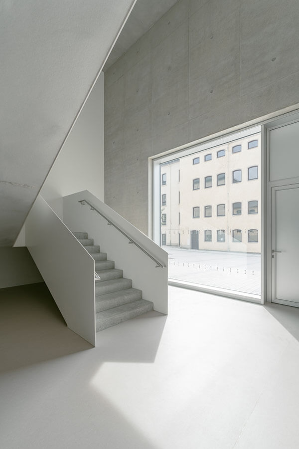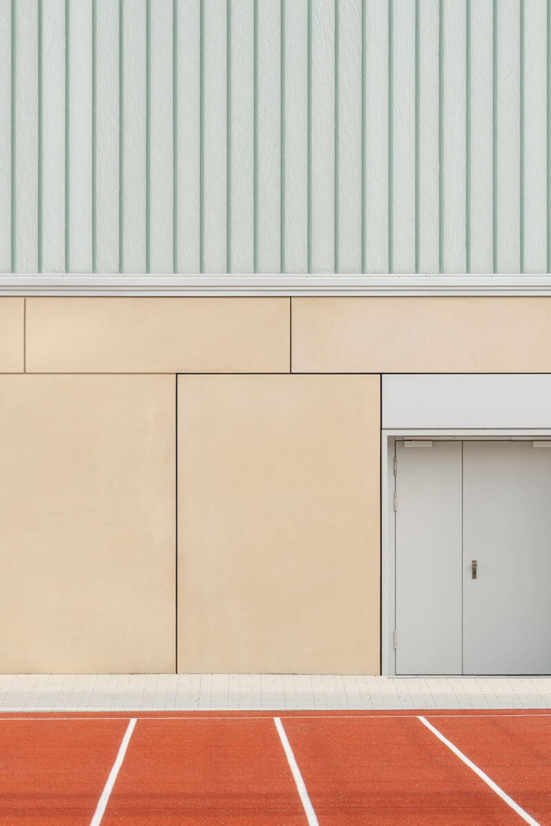 Die großflächige Verglasung bringt diffuses Tageslicht ins Halleninnere und sorgt für eine helle, gleichmäßige Raumatmosphäre. In den Abendstunden verwandelt sich die Halle in eine leuchtende Skulptur im Stadtraum – ein architektonisches Signal, das Sport, Gemeinschaft und Offenheit sichtbar macht. Das Glas erfüllt nicht nur gestalterische, sondern auch funktionale Anforderungen: Wärmeschutz, Schallschutz und Wartungsarmut sind integraler Bestandteil des Konzepts. In Kombination mit Putz- und Sichtbetonflächen entsteht ein spannungsvolles Zusammenspiel aus Transparenz, Robustheit und Struktur.
