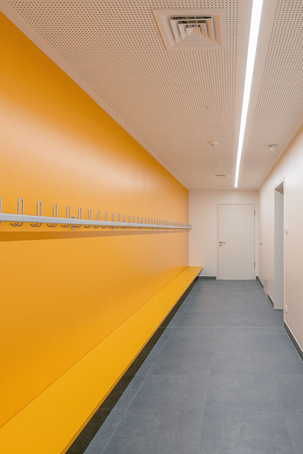 Eine teilverglaste Wand gibt dem Raum eine offene, kommunikative Atmosphäre. Entlang der Hallenlängsseite sind Umkleiden, Sanitär- und Geräteräume kompakt angeordnet – kurze Wege und klare Abläufe bedeuten leichte Orientierung und einfache Nutzbarkeit.