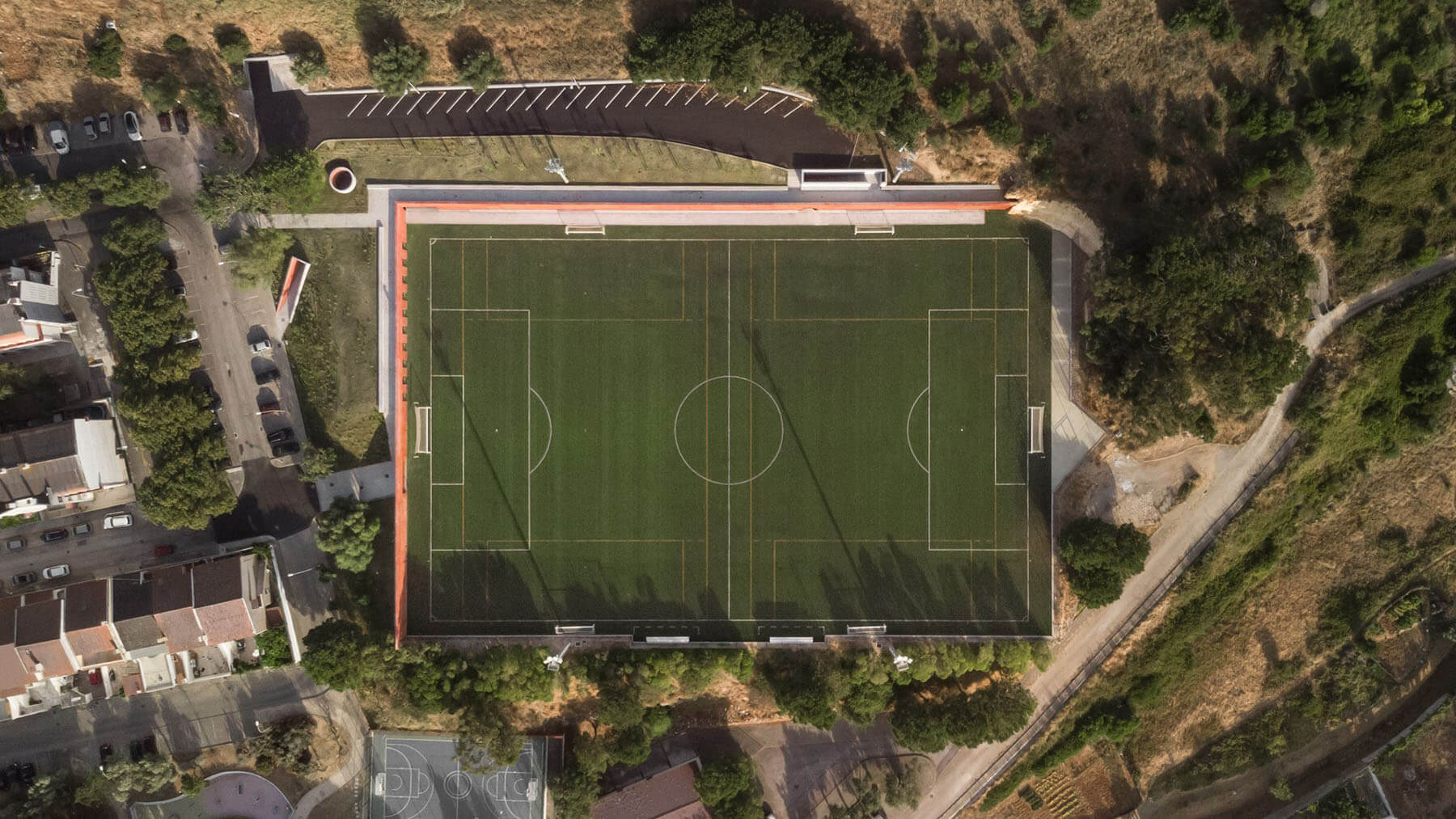 Vor der rauen Topografie von Porto Salvo wird das Campo de futebol da Lage direkt in die Landschaft gemeißelt. Anstatt dem Standort ein fremdes Objekt aufzuzwingen, entsteht das Projekt aus dem Hang selbst heraus.