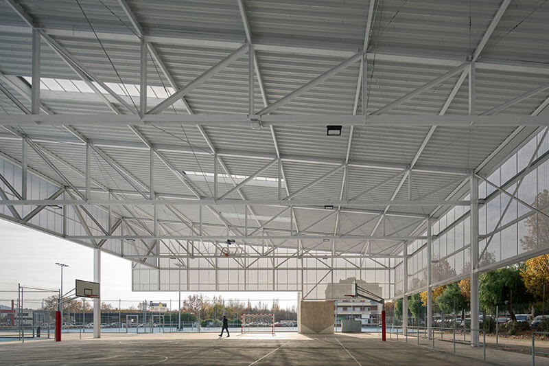 Designed by JPAM City Makers and Masala Consultors, the open-air hall now functions as a connecting element of a newly organized sports landscape. Large and small playing fields were organized around the roof like a chessboard.
