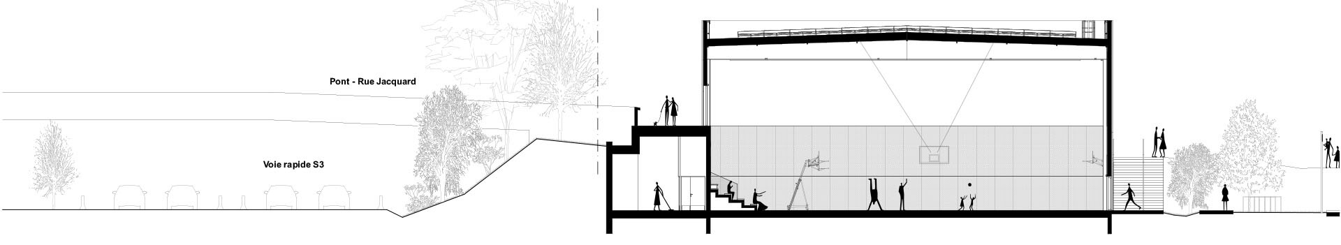 Diese urbane Promenade verbindet sämtliche Nutzungen des Petit-Quevilly Sports Complex: die Sporthalle, soziale Einrichtungen, das Freizeit- und Jugendzentrum, den Skatepark und das Stadion. Gleichzeitig macht sie die komplexe Topografie des Geländes erlebbar und verwandelt sie in ein prägendes räumliches Element.