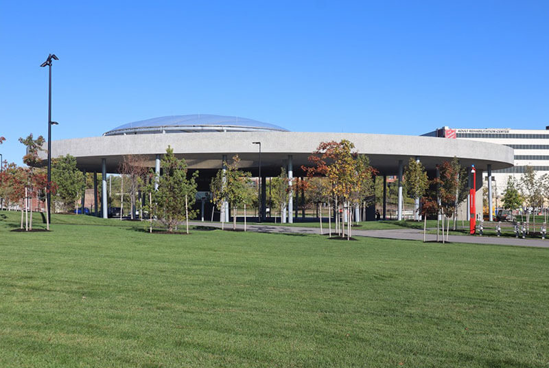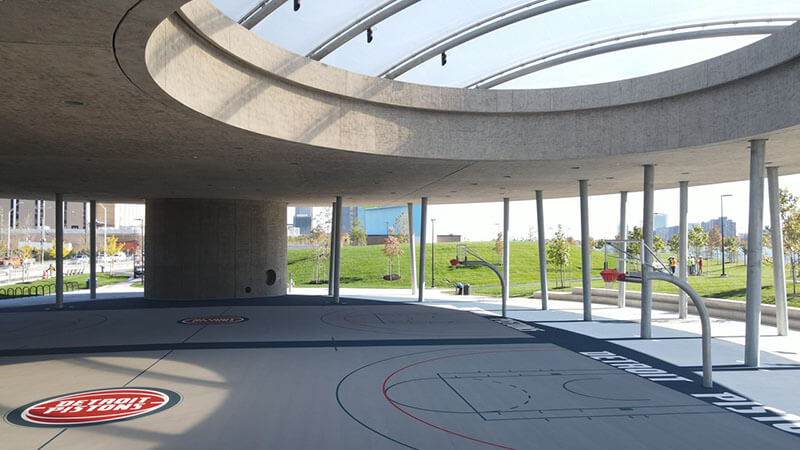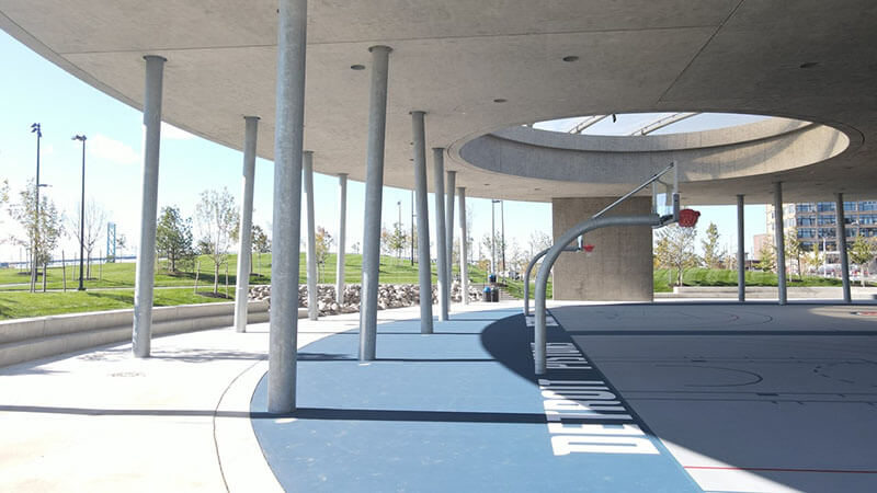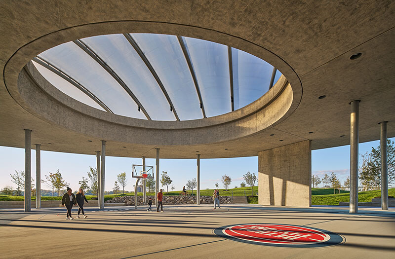 The architectural identity of Ralph C. Wilson, Jr. Centennial Park is characterized in particular by the William Davidson Sport House. The 2,600 m² open-air hall is supported by 33 steel columns, above which spans a sculptural concrete roof with an approximately 185 m² skylight. Daylight floods the open structure, which houses a standard-compliant basketball hall. The space functions both as a sports hall and as an outdoor facility and enables sports and leisure use day and night, at any time of year.