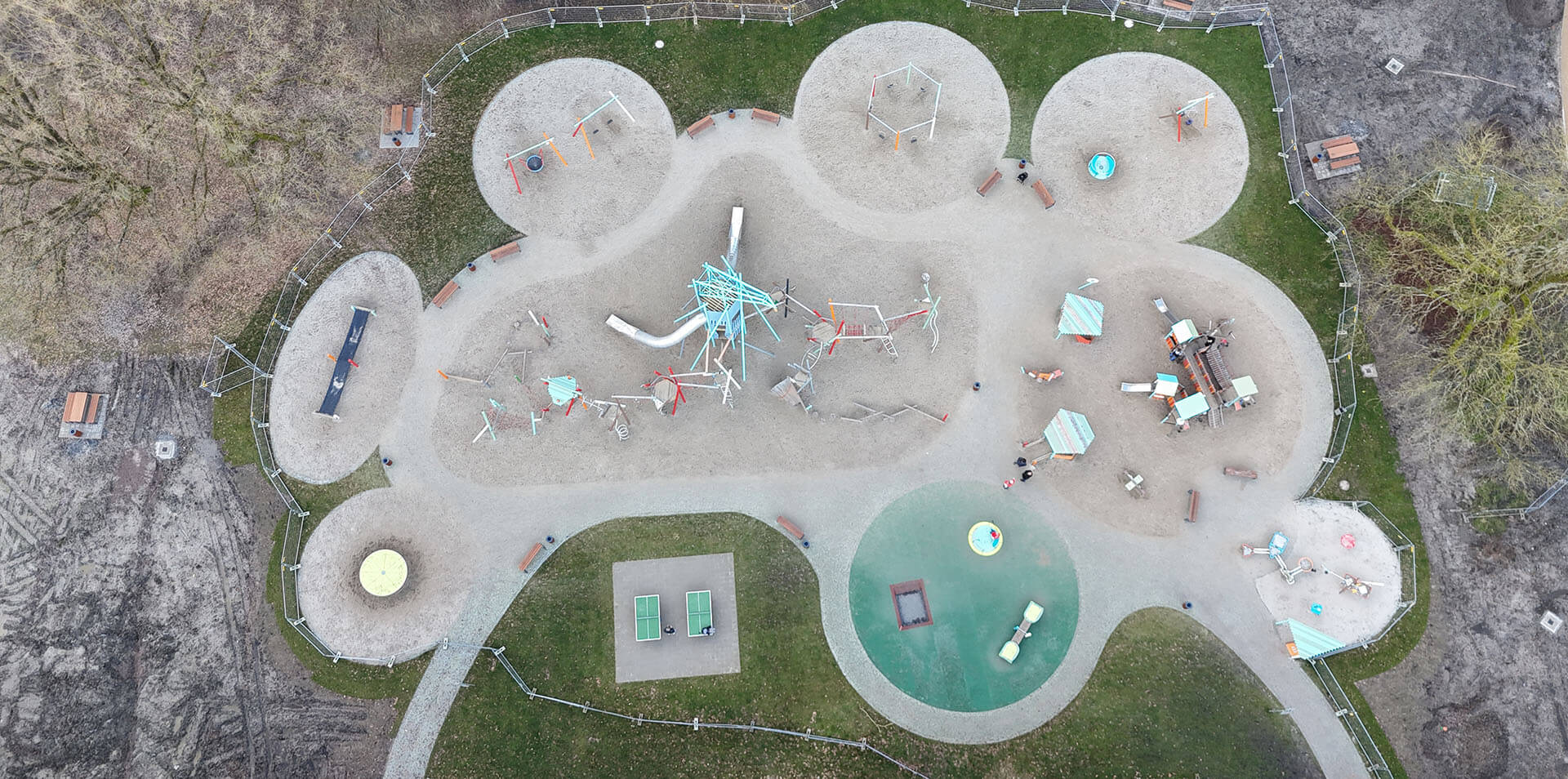 Das Büro Neumann Gusenburger war für die landschaftsplanerische Konzeption verantwortlich und sorgte für die harmonische Integration des Spielplatzes in die bestehende Parklandschaft. DIE SPIELPLATZ-MACHER übernahmen die fachgerechte Montage der Spielgeräte in enger Zusammenarbeit mit dem Garten- und Landschaftsbauer Friedemann Richter. Von den Kranarbeiten über den Geräteaufbau bis zum Feinschliff funktionierte die Kooperation aller Beteiligten reibungslos – ein entscheidender Faktor für den Projekterfolg.