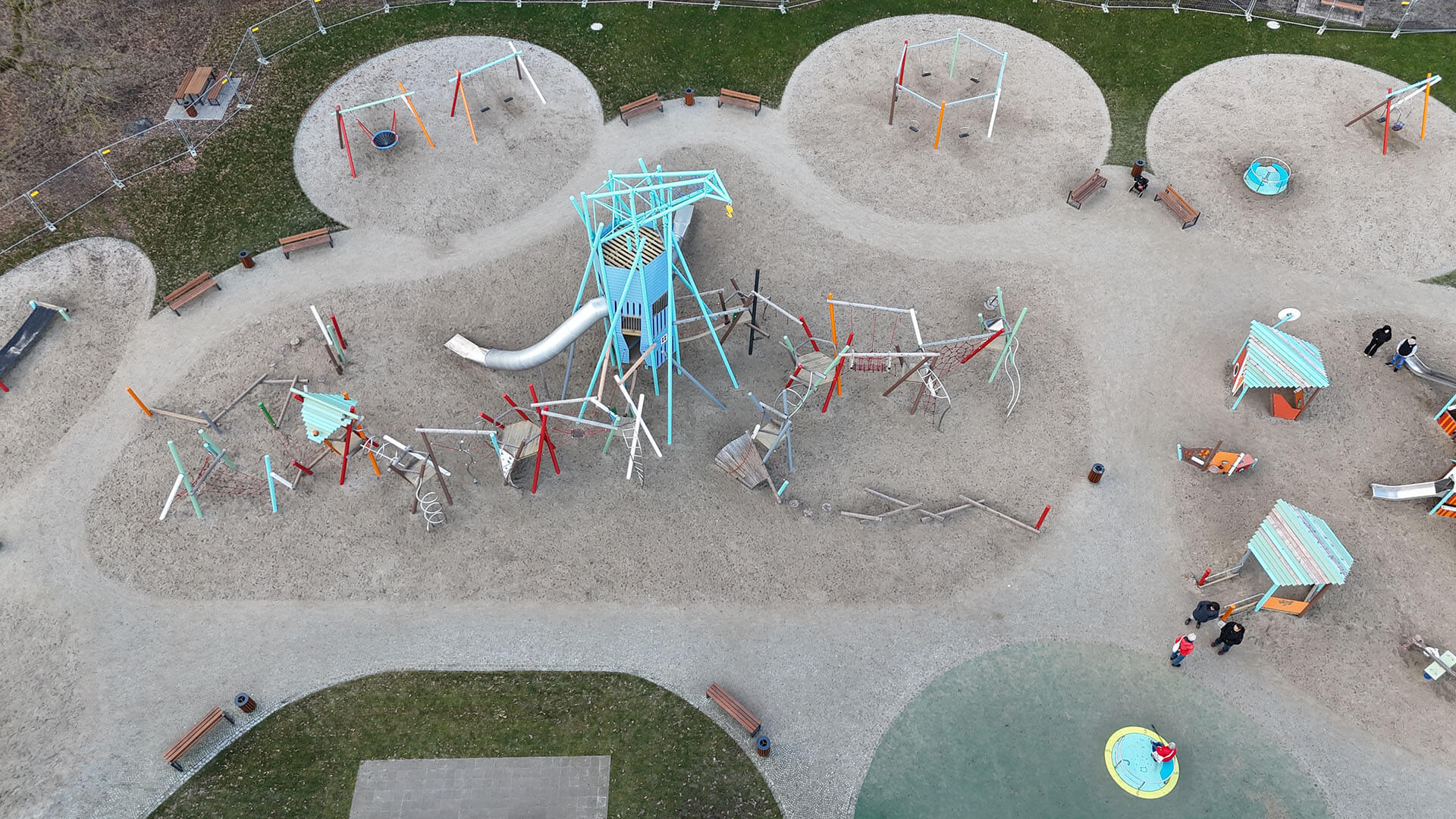 Zu den weiteren Attraktionen gehören ein großzügiger Sandspielbereich für kreatives Spielen, eine Doppelschaukel, ein Trampolin, eine Drehscheibe sowie eine beeindruckende, 30 Meter lange Seilbahn.