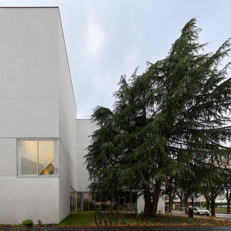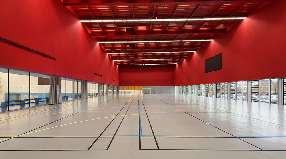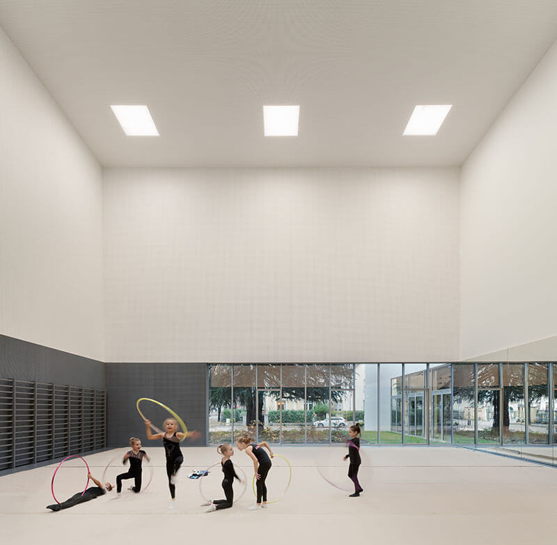 Die Einbindung in den Stadtraum erfolgt über gezielt gesetzte Öffnungen und Blickbeziehungen. An der Kreuzung zweier Hauptachsen präsentiert sich ein großzügig verglaster Tanzsaal und macht die Aktivitäten im Inneren sichtbar. Auf der gegenüberliegenden Seite wurde das Gebäude zurückversetzt, um einen bestehenden Libanon-Zedernbaum zu erhalten, der den Raum für Rhythmische Sportgymnastik mit seiner 12 Meter hohen Decke verschattet.