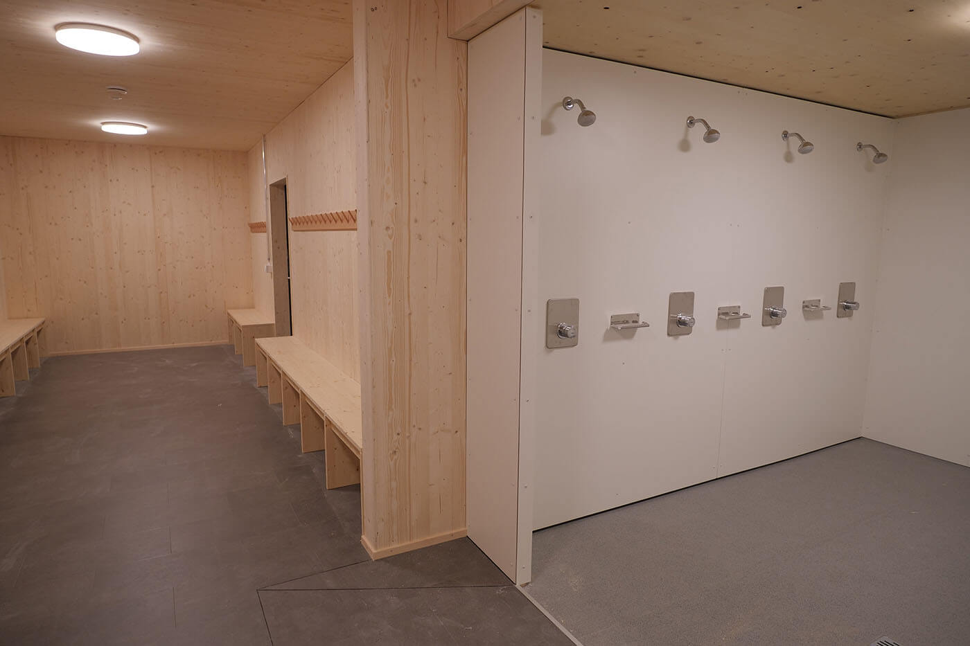 Die Nebenräume sind in vorgefertigten Modulen untergebracht, die bereits komplett ausgerüstet angeliefert wurden (Baukasten). Diese umfassen die Umkleideräume mit Duschen, Sanitäreinrichtungen und weitere Funktionsräume. Auch sämtliche technische Ausstattungen waren bereits in den Modulen integriert.